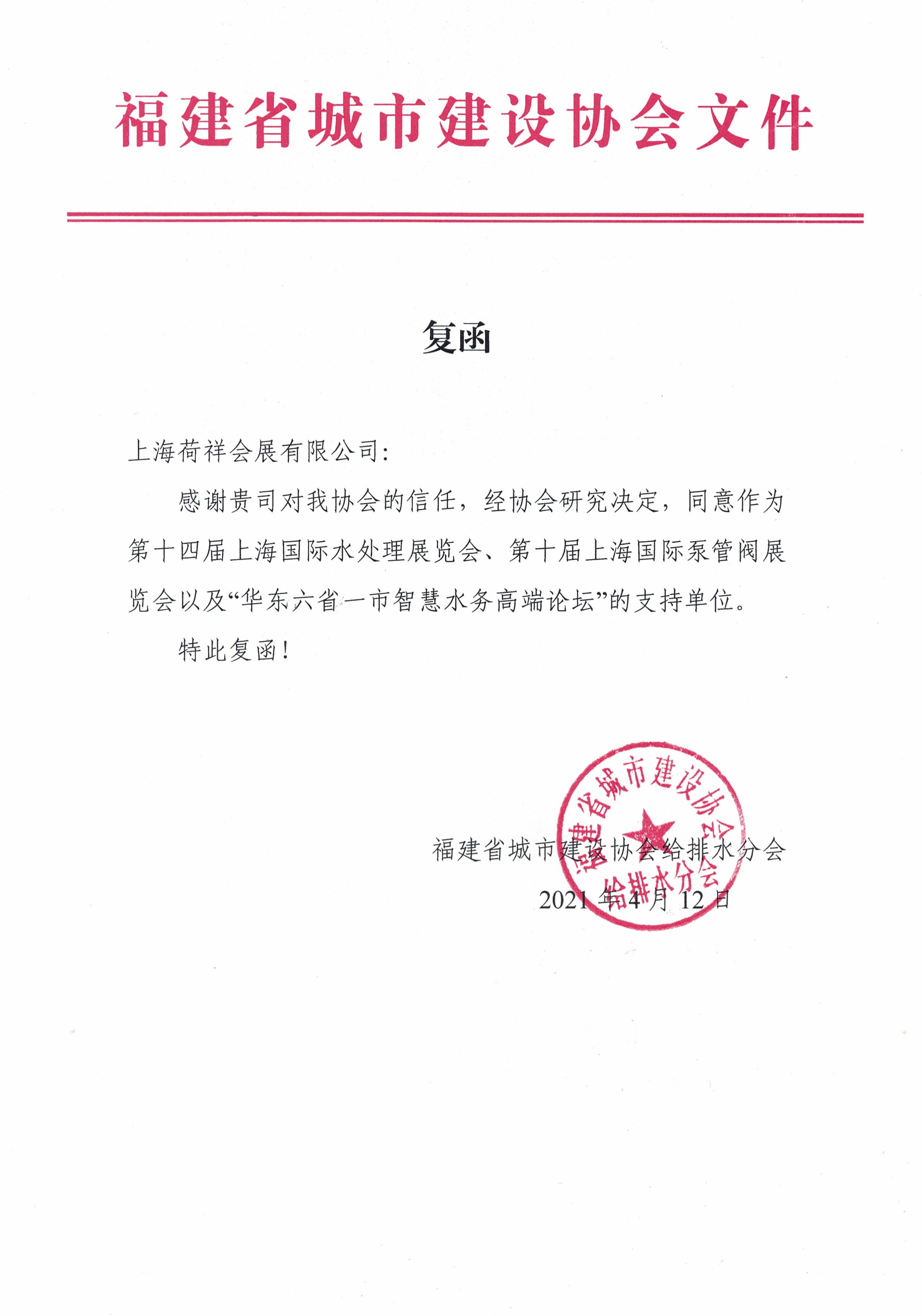 為幫助福建省水務企業進一步開拓市場,促進國內外企業之間的經貿合作與技術交流,福建省城市建設協會給排水分會決定將全力支持 2021 年 6 月 2 日在上海國家會展中心(虹橋)舉辦的2021華東六省一市智慧水務高端論壇,與主辦方上海荷瑞展覽有限公司攜手為城鎮水務行業搭建一個國際性商貿交流平臺,助力企業更好的抓住行業機遇,積極促進我國城鎮水務行業在"十四五"期間獲得快速發展。