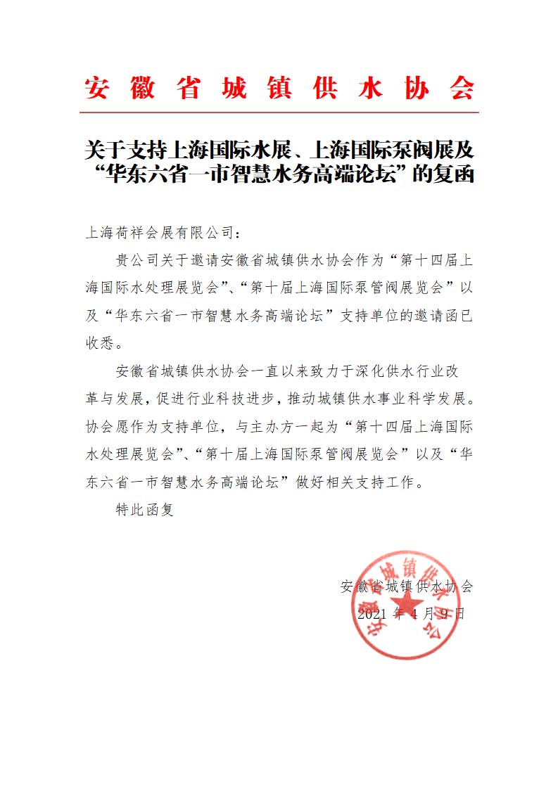 為幫助安徽省水務企業進一步開拓市場,促進國內外企業之間的經貿合作與技術交流,安徽省城鎮供水協會決定將全力支持 2021 年 6 月 2 日在上海國家會展中心(虹橋)舉辦的2021華東六省一市智慧水務高端論壇,與主辦方上海荷瑞展覽有限公司攜手為城鎮水務行業搭建一個國際性商貿交流平臺,助力企業更好的抓住行業機遇,積極促進我國城鎮水務行業在"十四五"期間獲得快速發展。
